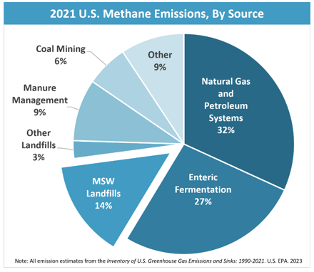Municipal solid waste landfills are the third-largest source of human generated methane emissions in the United States, accounting for approximately 14.3% of methane in 2021. Reducing methane emissions from MWSLs is part of the strategy to reduce greenhouse gas emissions for climate change responses.