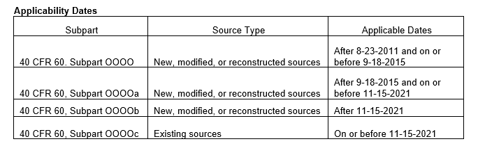 The main purpose of the rules is to reduce the volatile organic compounds (VOCs) and greenhouse gases (GHG) methane from new onshore oil and gas facilities. Below are the OOOO rules and applicability dates.