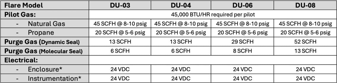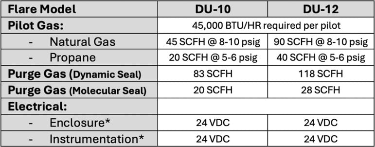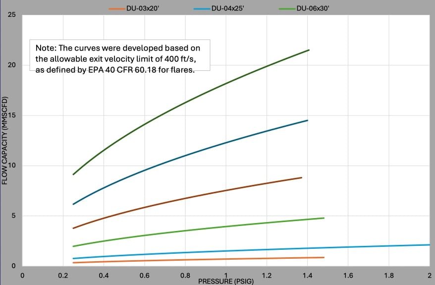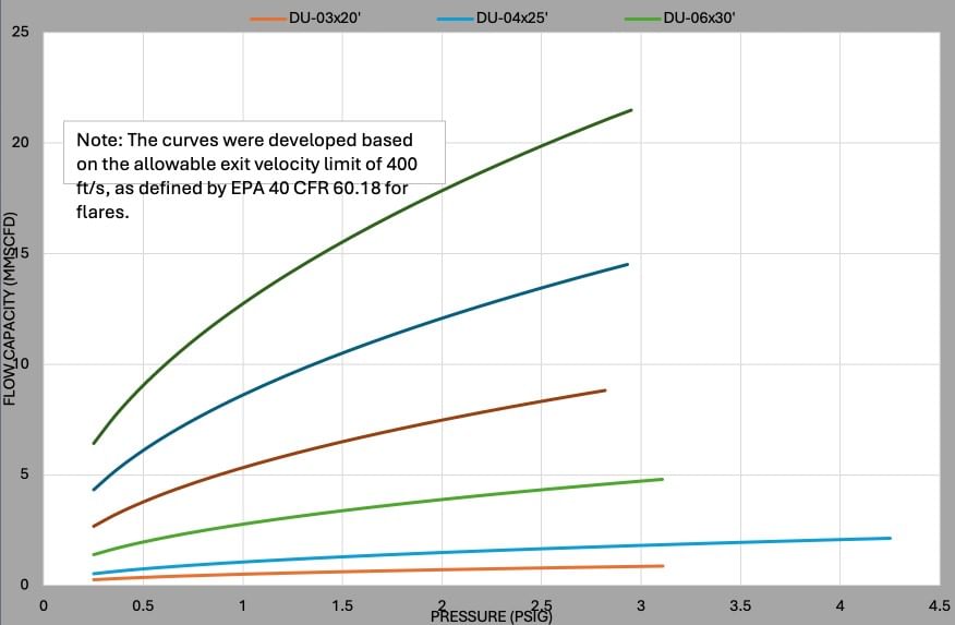 • Inlet Pressure: Flares can handle a range of inlet pressures from 0.1 psig up to 50 psig. The standard steel piping of the gas riser can structurally handle pressures higher than 50 psig, considering that flare systems are open to atmosphere and do not retain pressure. However, there is potential for the flare tip flame to break away or lift off form the flare tip at pressures higher than 50 psig. Special design considerations can be utilized at pressures higher than 50 psig to fit your specific needs.